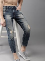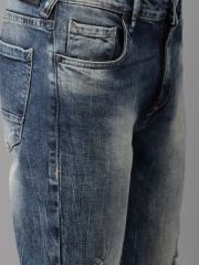 Blue medium wash 5-pocket mid-rise jeans, mildly distressed with light fade, has a button and zip closure, waistband with belt loops