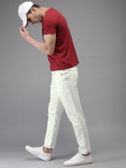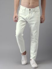 White light wash 5-pocket mid-rise jeans, clean look with no fade, has a button and zip closure, waistband with belt loops